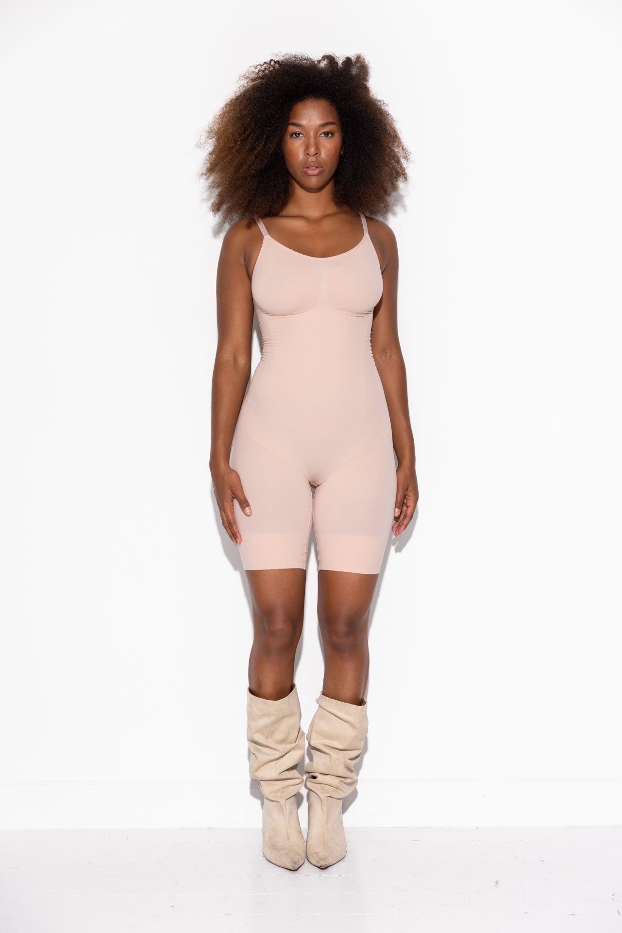 • Thigh Zone: The leg length provides comfort and gentle firmness around the thighs. The flexible yet supportive material allows the length to be adjusted as needed to prevent unwanted lines. The bodysuit also helps reduce irritation caused by thigh chafing, especially in warmer conditions, while creating a visually smoothing effect.